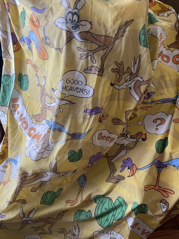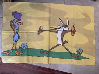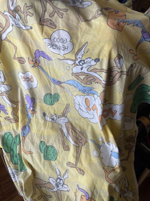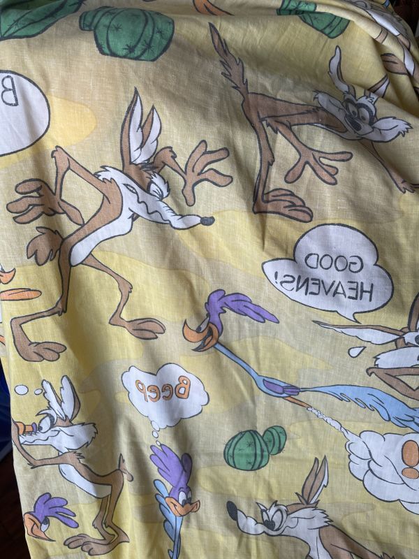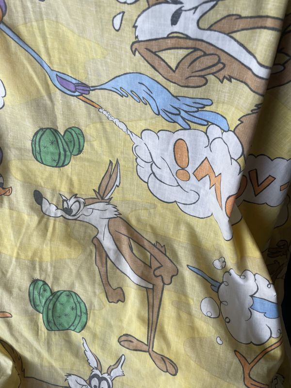 ロードランナーやワイリーコヨーテ達がイエローファブリックいっぱいに描かれています。