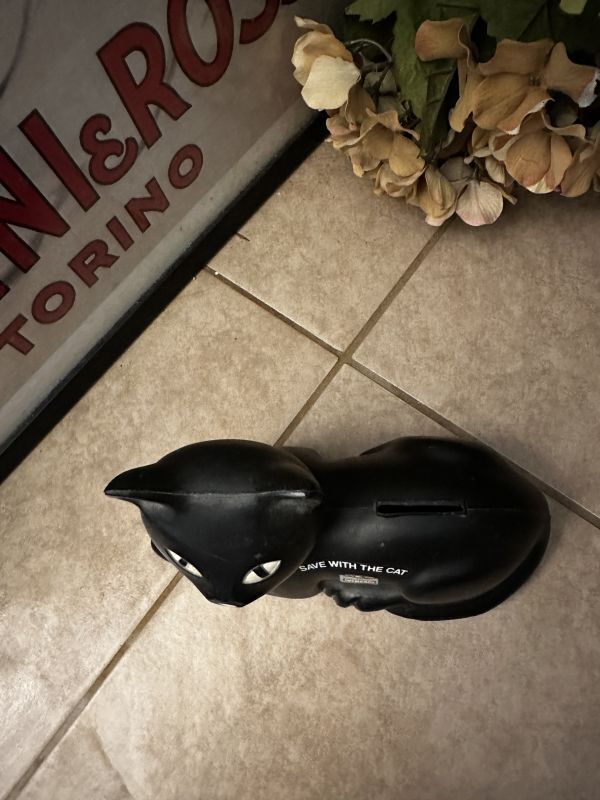 アメリカの電池会社のキャラクターの黒猫が横たわっている可愛い置き物と思いきや貯金箱なんです。ステッカーもちゃんと付いてます。