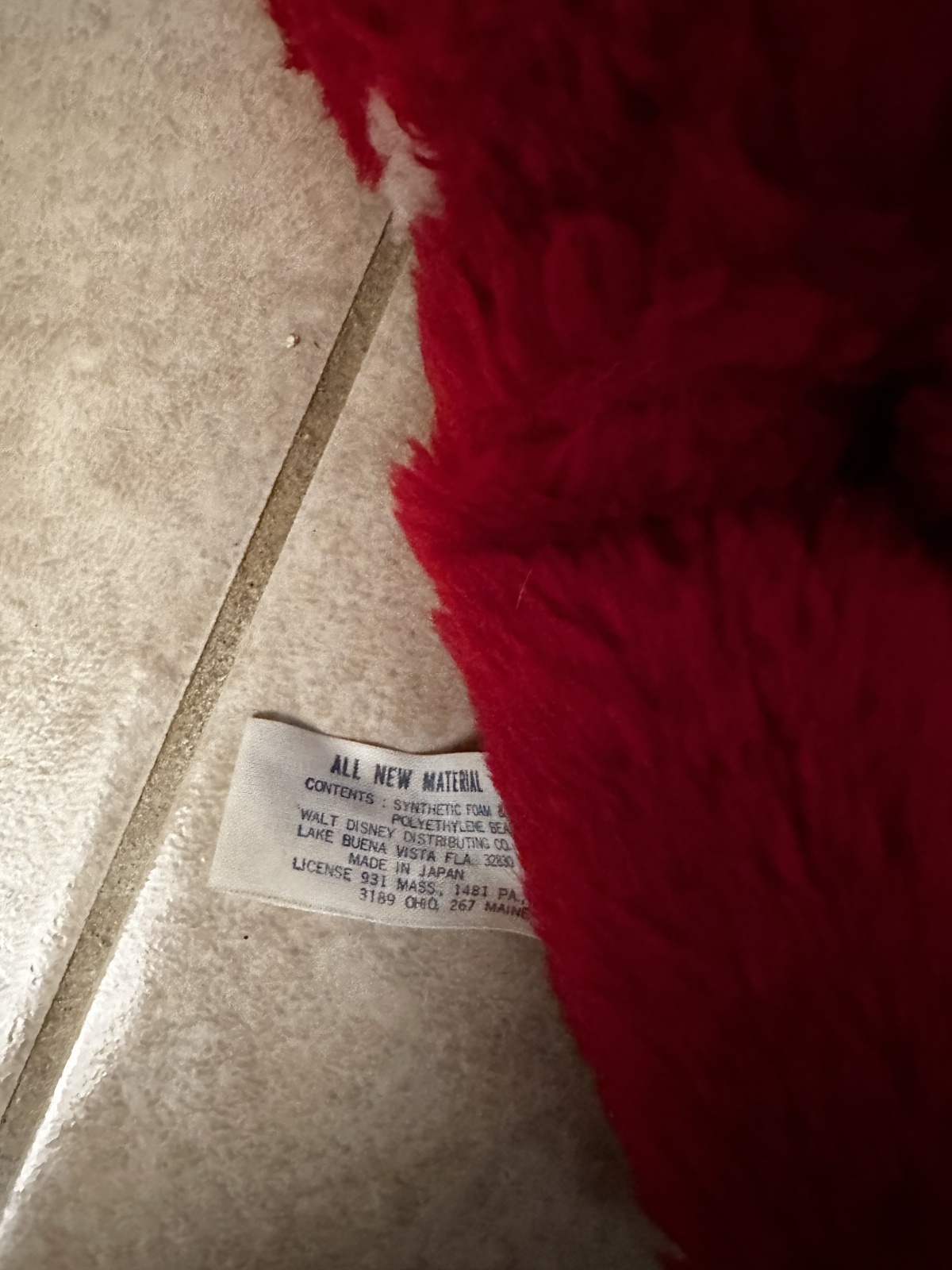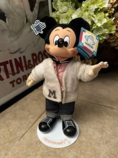 顔がラバーフェイスなのでさらに可愛さ倍増です。さらにはオリジナルの赤いスタイ(よだれかけ)付き。ミッキーの名前の刺繍も良いですね。Made in Japan、日本製です。